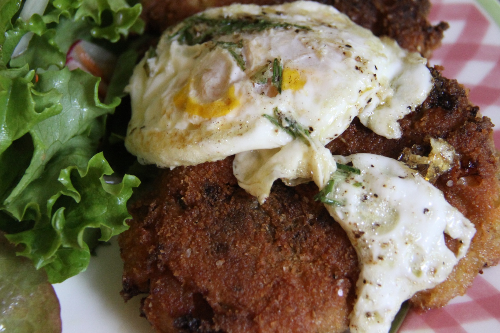 Once again, the leftover panade was refrigerated overnight. It was firmer than in the past, but still very moist. Then Michelle had the idea to form the cold panade into patties and dip them in the traditional triumvirate of seasoned flour, then egg, then bread crumbs. This time, the breaded panade patties fried up crusty and golden, with hardly a spatter or spit. Topped with a fried egg and plated with a green salad, we finally understood Judy Rodgers’ teachings. Panade, risen again.