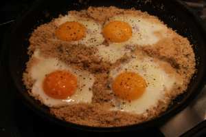 One of the nice things about having chickens in the backyard is that we rarely run out of eggs—which means we’re always ready for breakfast. (We’ll have fewer eggs than usual this Winter, but that’s best told in another post.) “Breakfast” isn’t necessarily a morning thing in Gourmandistan. Since we try to have Steve’s home-cured bacon around along with fresh eggs, breakfast can be the perfect answer to “What’s for dinner?,” especially if we’ve been too busy/frazzled to plan ahead. Of course, Michelle prefers that the evening meal still have some elegance, even if we’re being simple. (Steve, if left alone, will occasionally just eat a plate of scrambled—but he has trouble restraining his bachelor mentality.) One way Michelle has helped us enjoy breakfast as dinner is by deciphering The Zuni Cafe Cookbook‘s somewhat inscrutable instructions (what does “just oversaturate” mean, Judy Rodgers?) for “Fried Eggs in Bread Crumbs.” It’s a simple, tasty way to dress up a batch of eggs—and conveniently comes with its own toast.