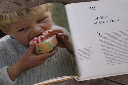 In Chapter III, “A Way of Their Own,” Fisher details her view of how French “ways with food and drink are not exactly the same as other people’s ways.” The chapter begins with a full-page photo of four-year-old Jean-Baptiste Goethals, a chubby-cheeked blond boy biting into a buttered, radish-topped baguette slice.