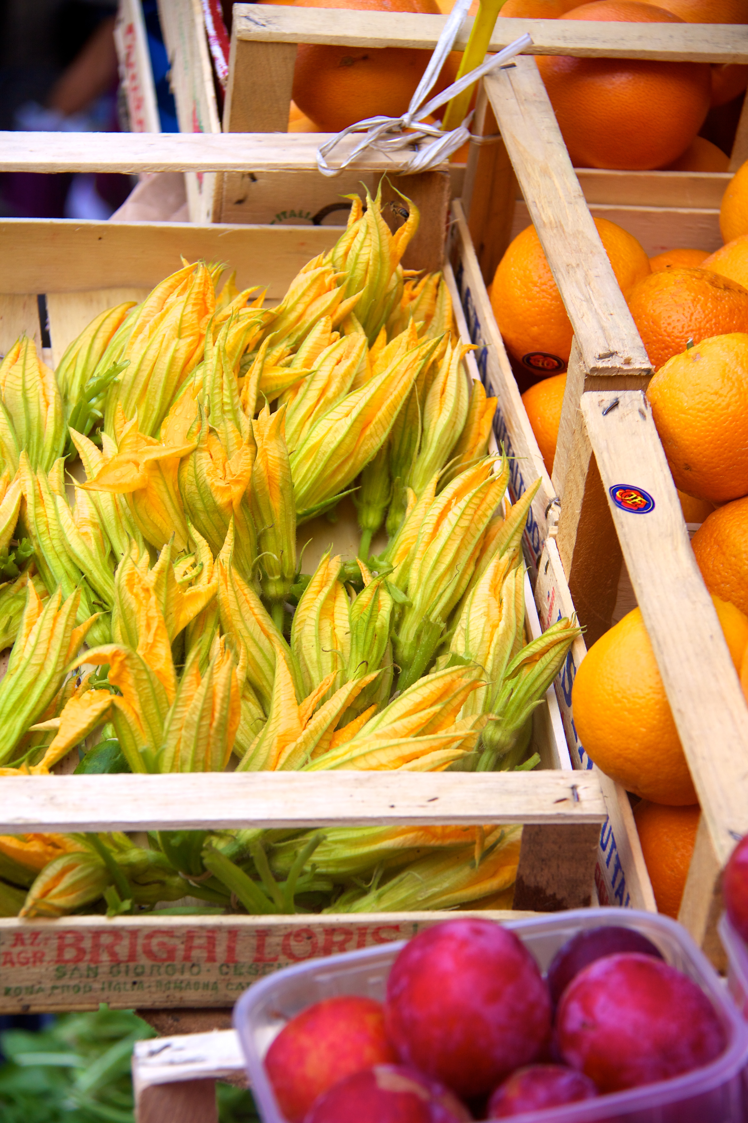 Zucchini blossoms and plums (though not prune plums) at Padua, Italy market
