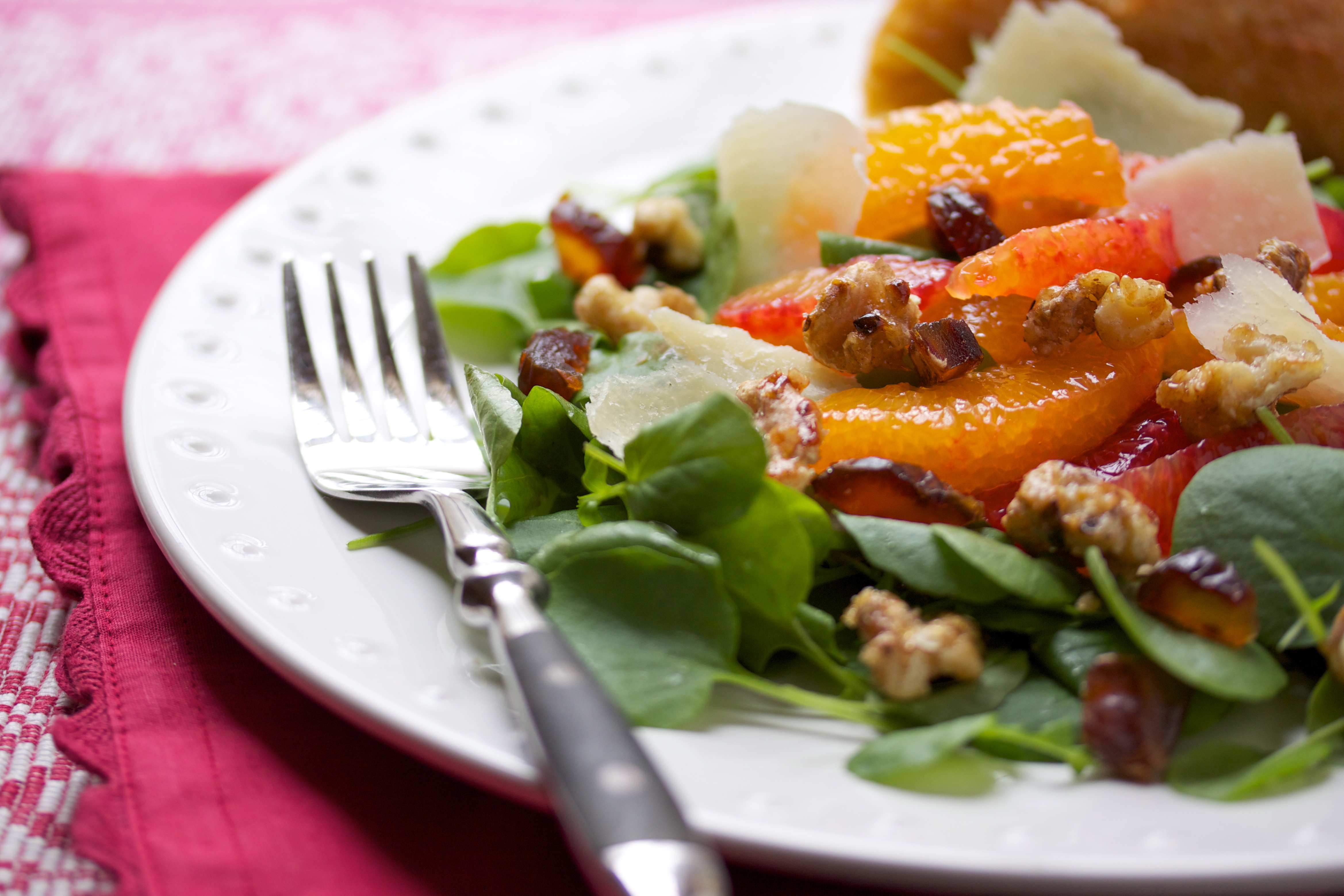 The path to this salad began a decade ago at Fish La Boissonnerie, a lovely little bistro on Rue de Seine in Paris. Featuring baby arugula, shavings of Parmesan cheese and sliced dates, the peppery green, sweet and salty salad charmed us greatly, and we took the idea back with us to Gourmandistan. There, like many things, the salad began to adapt. Desiring a more nutty flavor, we began using a walnut oil vinaigrette. Later, for even more punch, we started sugar-toasting walnuts and adding some chili flakes for extra kick, which led to orange slices to tone down the heat.  We began to use watercress, finding it less peppery and more tender than the original arugula, and soon the salad became not from Fish, but from ourselves. Add a bit of Blue Dog baguette and it’s a dinner in Gourmandistan by way of Paris, a pleasant journey we can’t seem to get enough of.