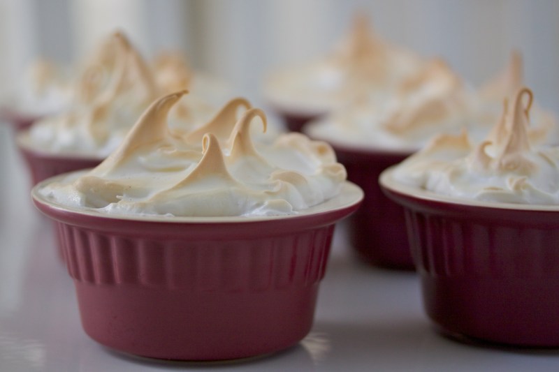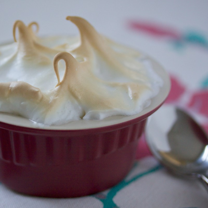 Make a meringue of the egg whites beaten with 8 TB of sugar. Swirl onto custards. Return to oven for 8-10 minutes until browned.