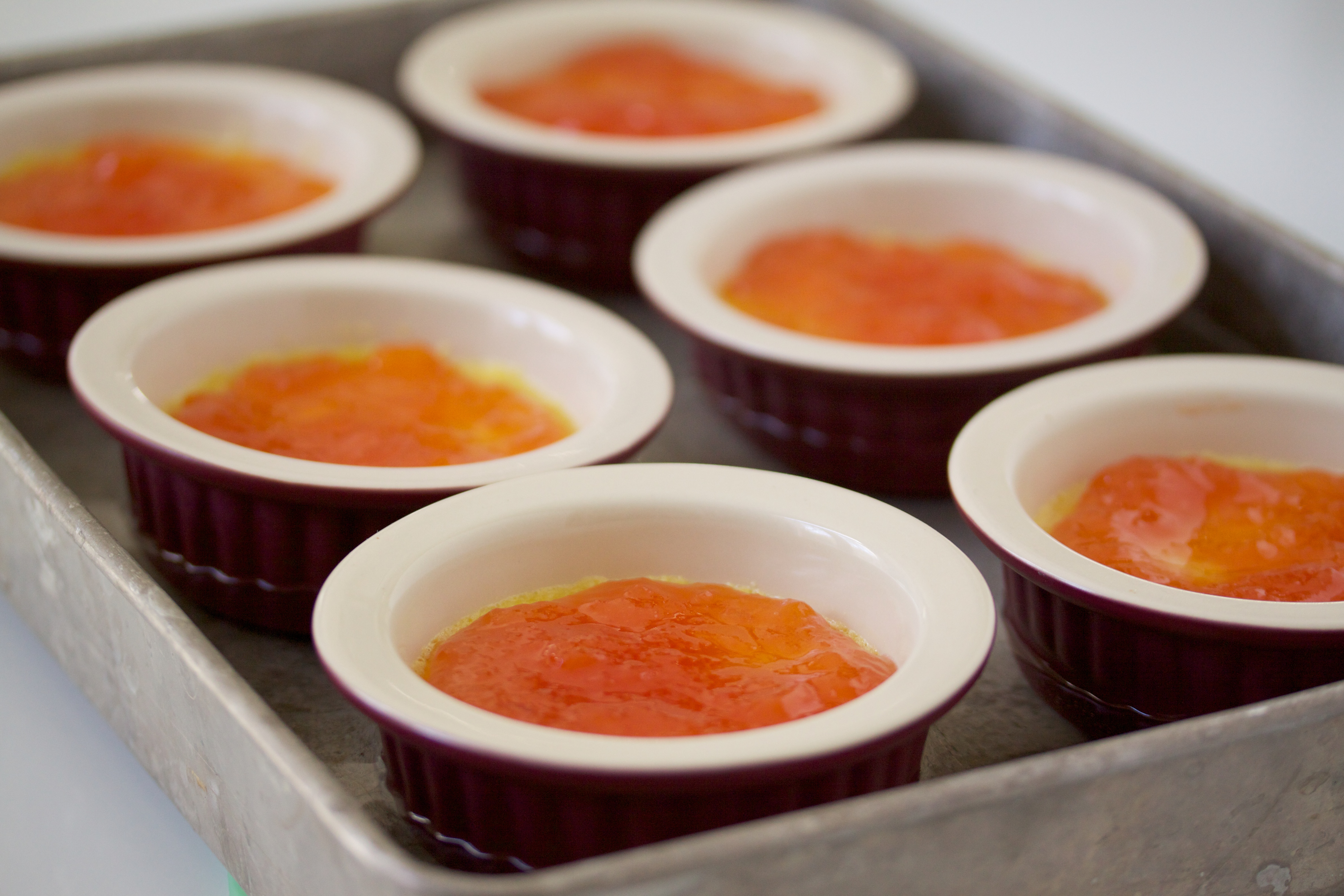 Remove from oven. Spread about 1 TB of jam on top of each custard.