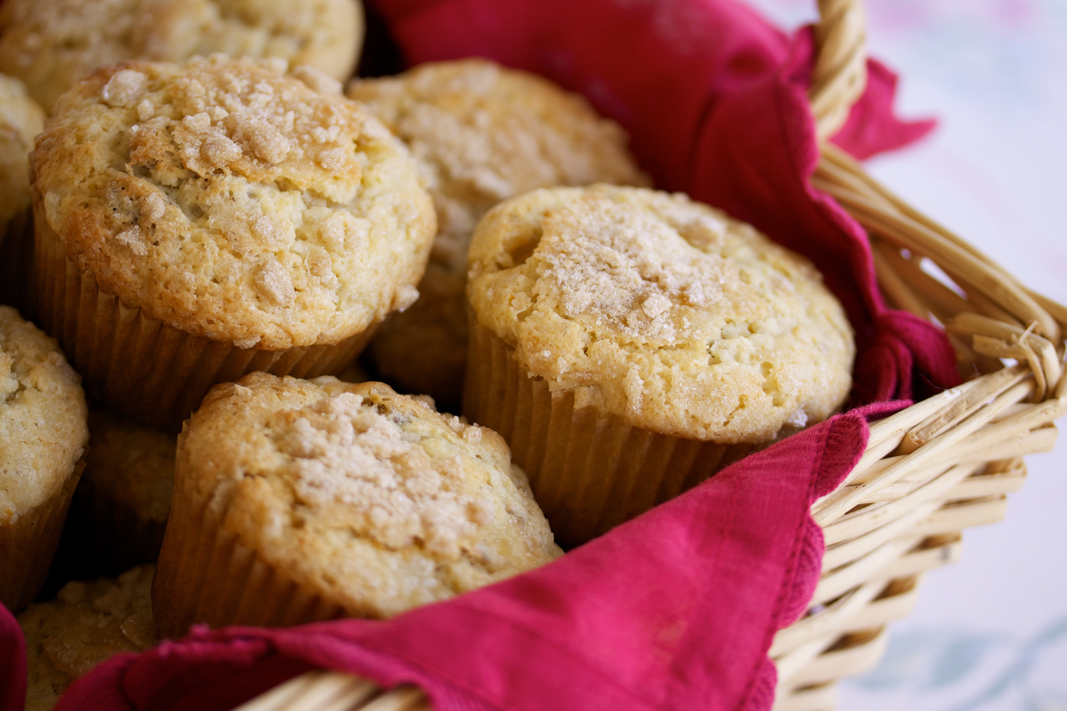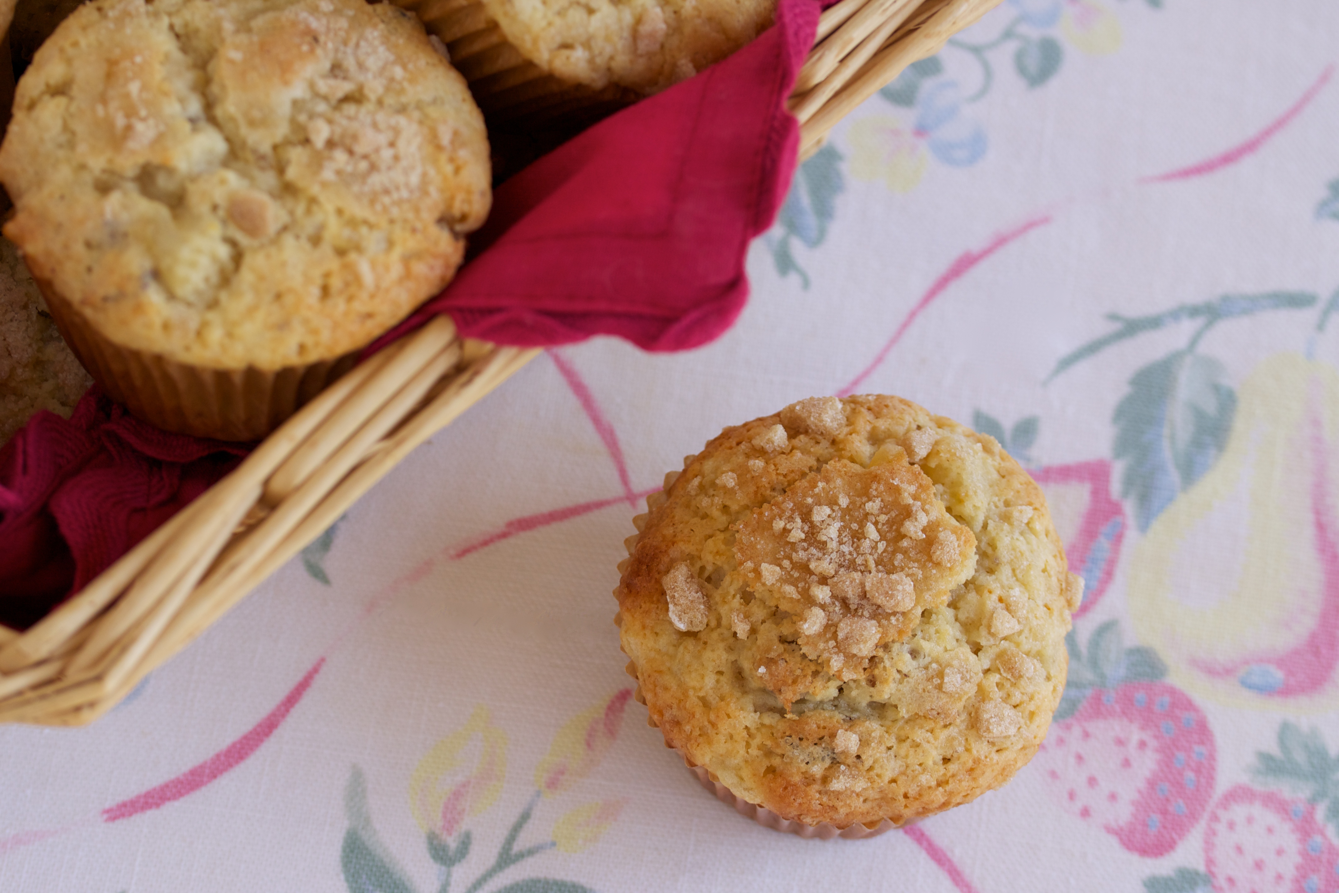 Fill muffin tins (either buttered or lined with papers) almost to the top.  Sprinkle coarse sugar over.