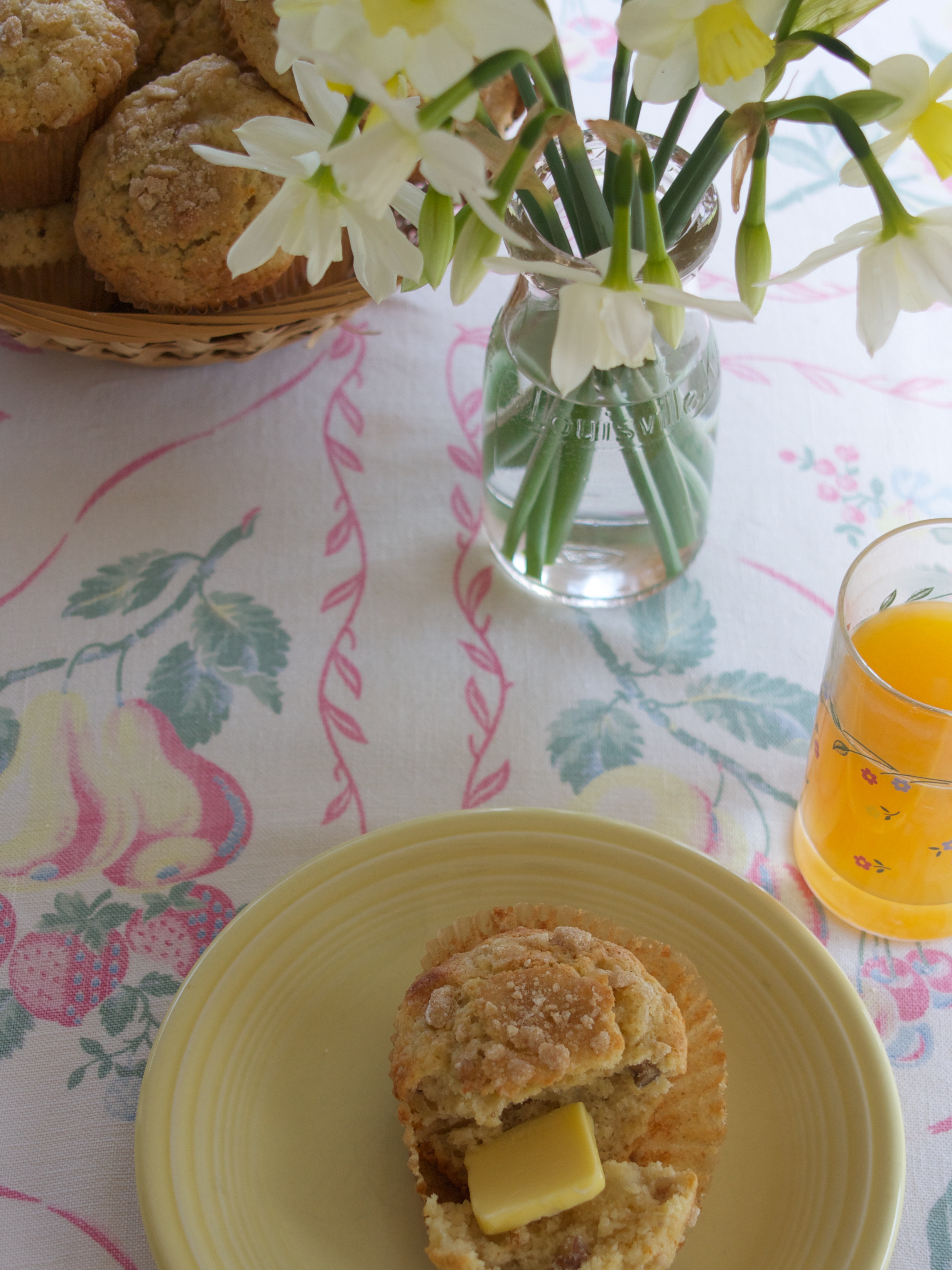 Michelle had found a recipe by Shirley Corriher, a biochemist and her fellow Vanderbilt alum, and became interested in this unusual, somewhat fussy muffin preparation. Buttering, then salting toasted nuts before adding them to the batter seemed bizarre enough. Multiple changes of oven temperature felt a wee bit finicky. And whipped cream? For muffins?  Totally strange. But those odd techniques along with the aforementioned contraband canned pears and some candied ginger made for tender and tasty muffins on an unseasonably warm Sunday morning in March.