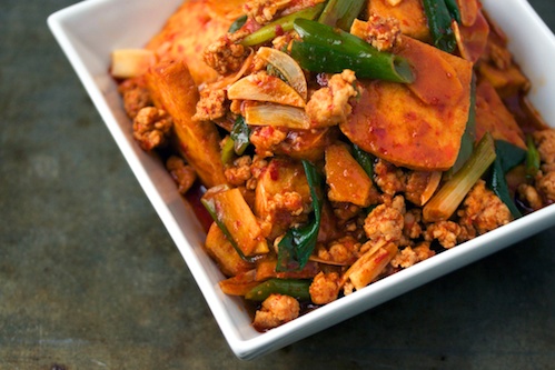 Every Grain of Rice focuses on dishes Dunlop says are “cheap,” “simple” and “extravagantly savoury” (the British version has all the cool spellings). One of our favorites so far has been Bear’s Paw Tofu (recipe here, following interview). Robust with chili bean paste, garlic, ginger and scallions, it makes a great meal. As so far our tofu slices have been barely bear paw-ish in appearance, we realize now we need a tofu that is softer than the local-ish firm variety we’ve been using, and look forward to trying the recipe again. With or without the optional ground pork, it’s delicious!