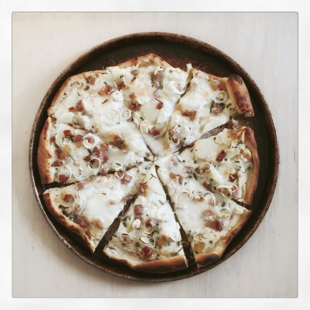 White sauce. Potatoes. Country ham. Buffalo mozzarella. Spring onions. Garlic. Chives. ← Previous Next →