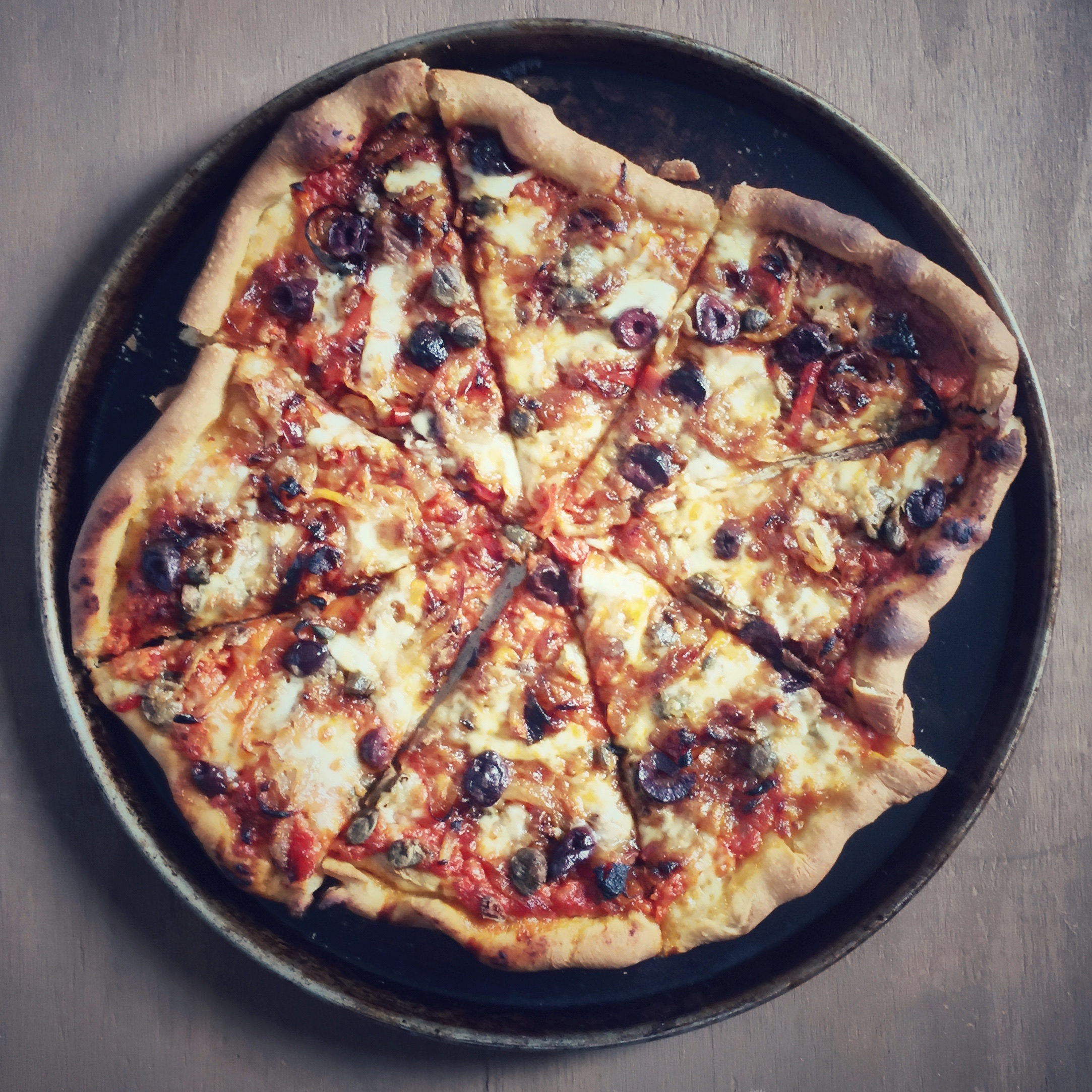 Red sauce. Mozzarella. Caramelized onion, fennel and garlic. Sweet peppers. Capers. Anchovies. Olives. ← Previous