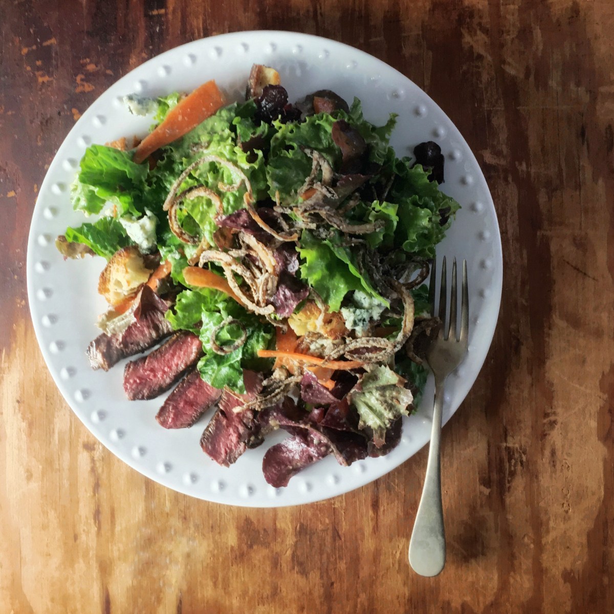 Steak salad with roasted shallot and garlic dressing