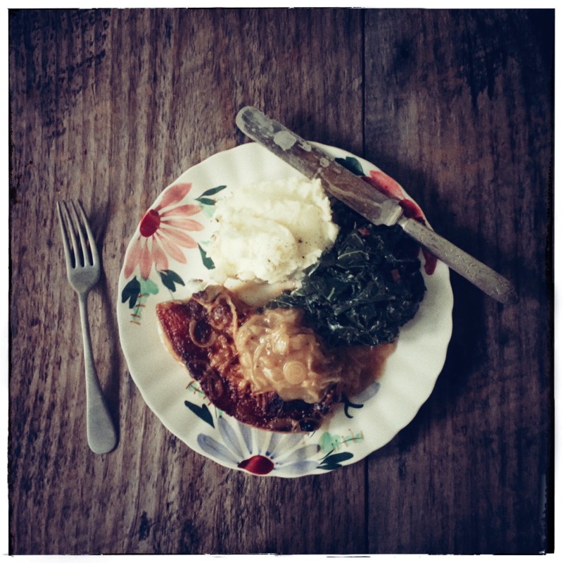 Mashed potatoes, a mess of slow-cooked greens and a meltingly tender chop soaking in rich sweet onion gravy is the kind of meal that demands a nap afterwards, at least if you haven’t been working in the fields all day. It’s not the kind of thing we have often in Gourmandistan, as we’re usually searching for something more exotic. But we had a moment recently when fresh local pork and farm share curly kale and potatoes reminded us of this comforting combination, and decided to see how Gourmandistan might make it.
